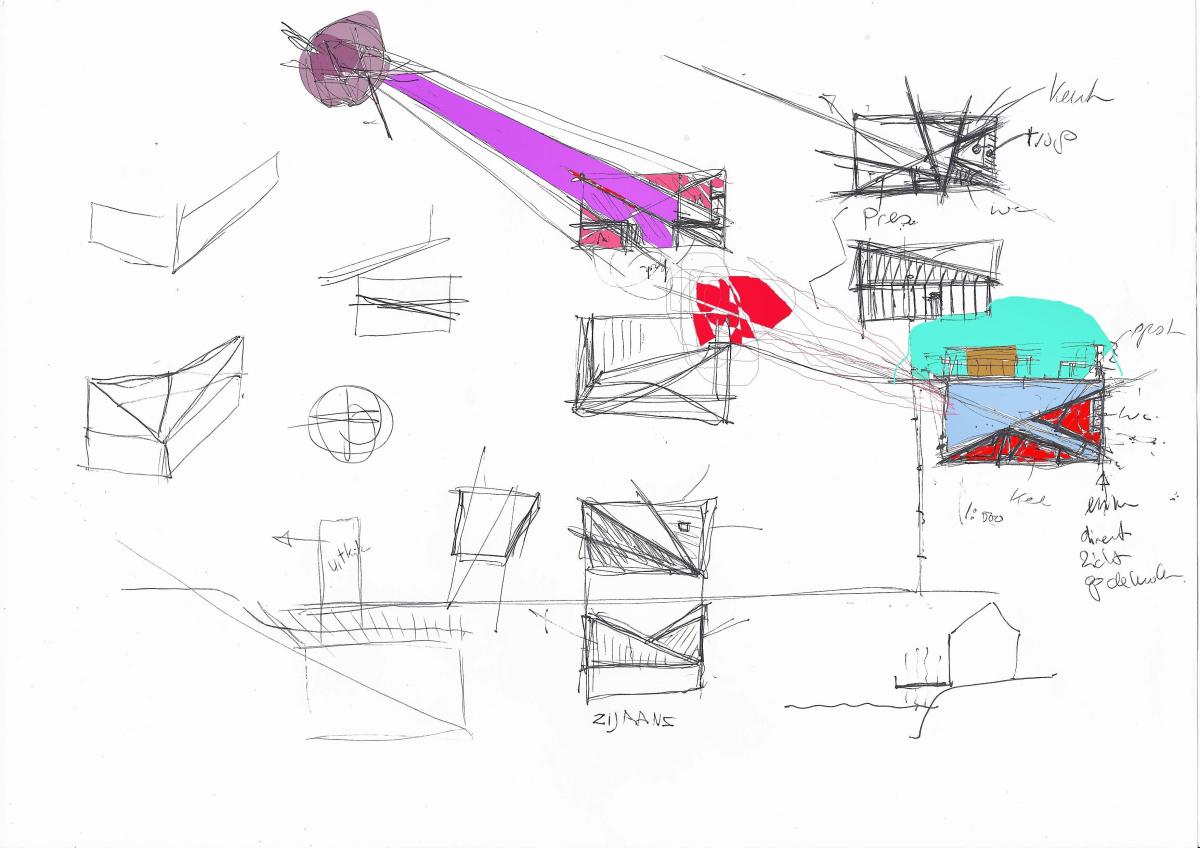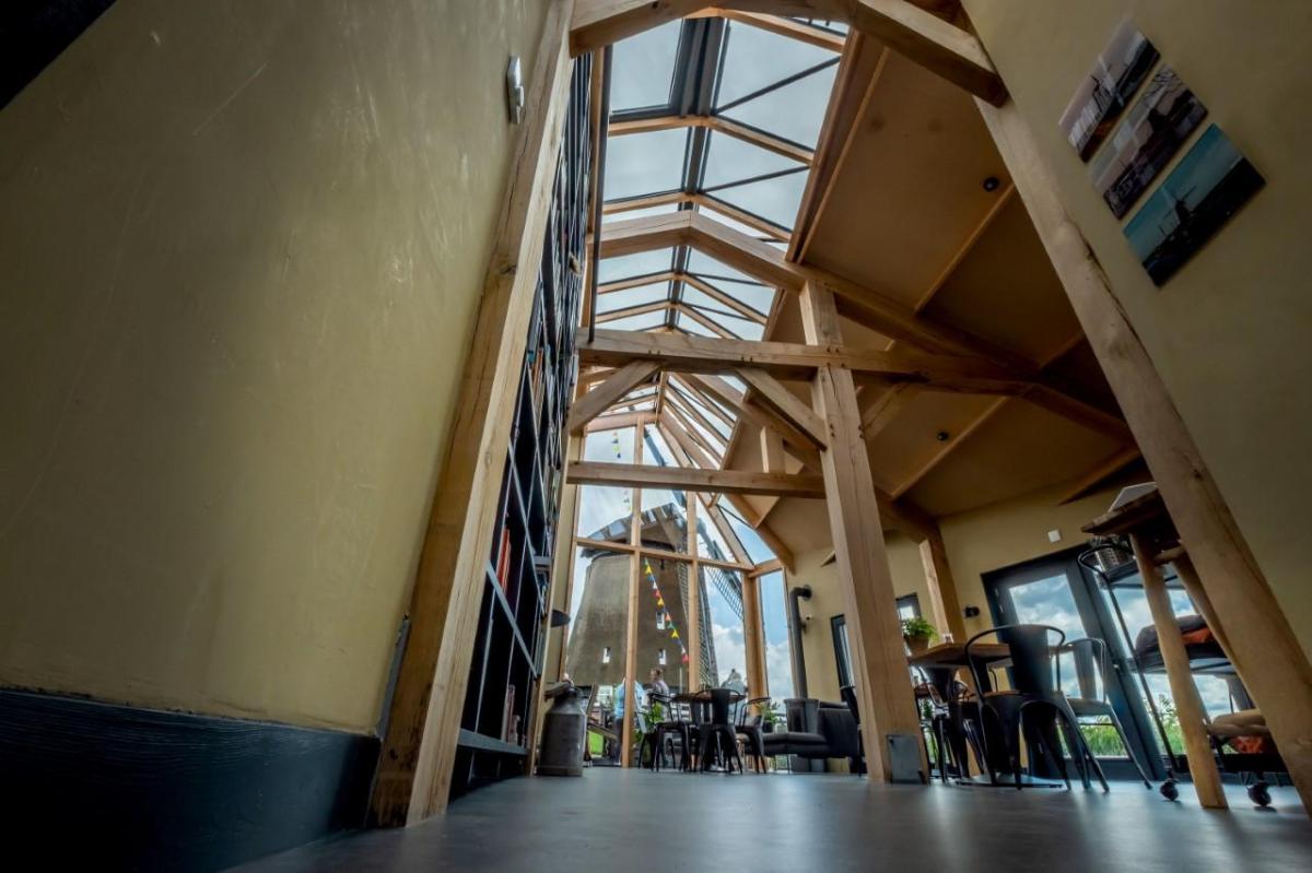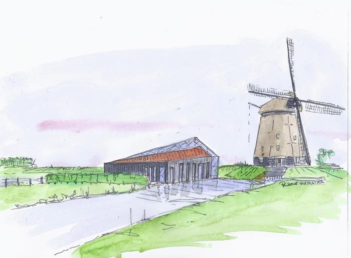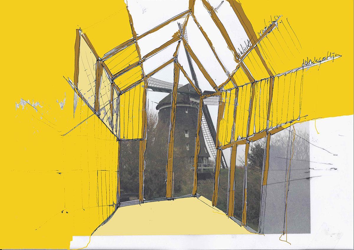 De blik van binnenuit richt zich direct op de molen maar ook het volume van het gebouw wijst die kant op, de nok ligt bijna diagonaal en voegt zich in de meest ideale vorm naar de biotoop van de molen.