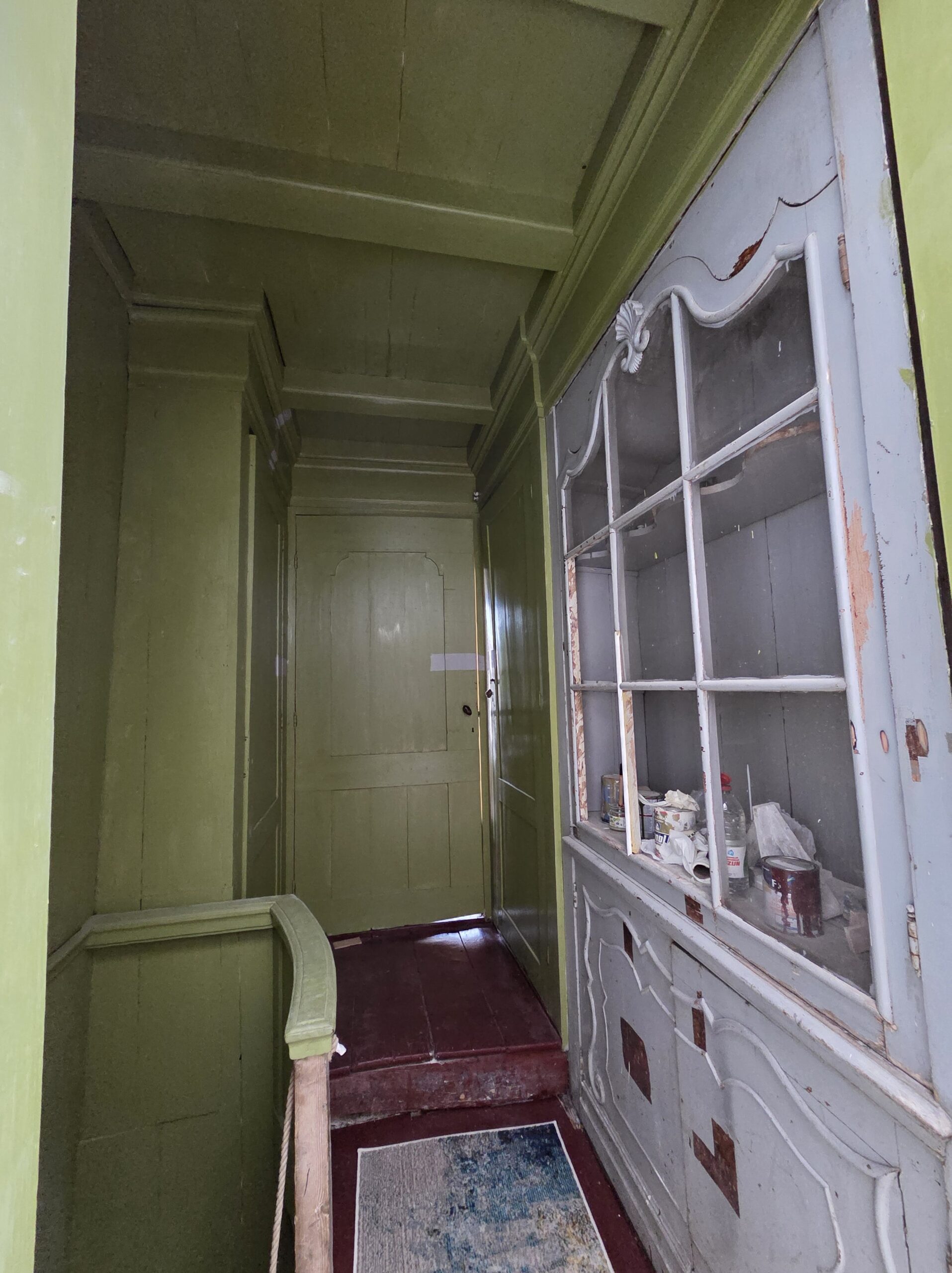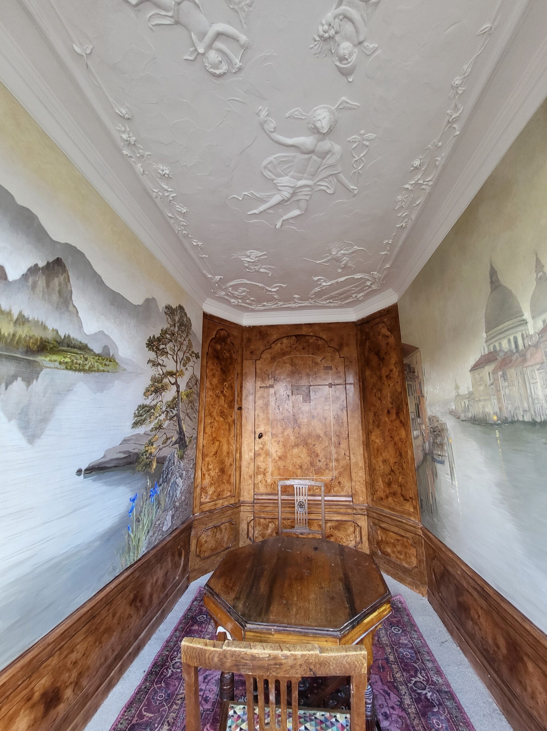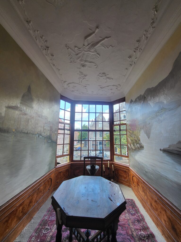 Gelijk met de plafond restauratie is zijn de houten onderdelen weer voorzien van een wortennoten houtimitatie. De wanden zijn voorzien van en eigentijdse landschap beschildering.  Alles na uitgebreid bouwhistorisch onderzoek door Odwin Ralling, Kleur historisch onderzoek door Leonieke Polman. Schilderwerk is gedaan door Trees Knapen, het plafond is door Barry Zardonie gerestaureerd. In 2026 zal het parket worden gerestaureerd door Saar Becks. Al het restauratie timmerwerk wordt gedaan door Rob de Vries zelf.