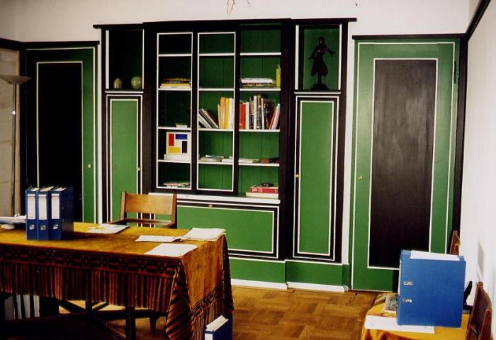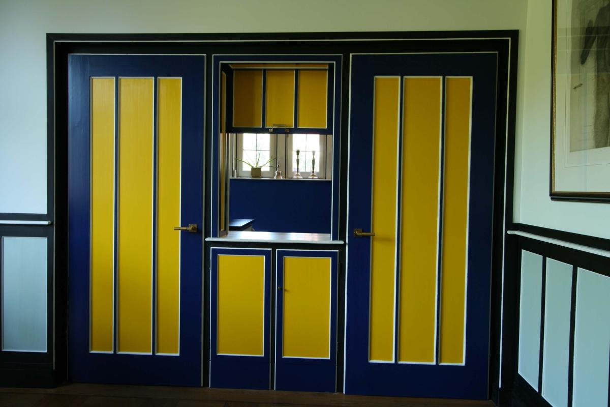 De elf kamers, die Van Doesburg ‘schilderijen zonder vorm’ noemden, hebben elk een eigen kleurstelling. Zo is de eetkamer wit-zwart-grijs, de salon paars-violet-groen en een slaapkamer vermiljoenrood-wit. Een gedegen en interessant onderzoek met veel bijzondere momenten. Zo konden aan de hand van de originele sjablonen uit het Van Doesburg-archief in het Nederlands Architectuurinstituut te Rotterdam de ornament-banden langs het plafond in de eetkamer toegeschreven worden aan Theo van Doesburg.